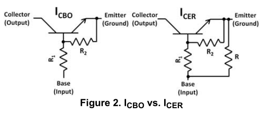 對于數字晶體管,重要的是要認識到晶體管和電阻網絡被認為是一個單元。 其示例是I CBO參數。 看看這個參數,人們會認為這是不可能的。 當R 2連接晶體管的發射極和基極時,發射極怎么能打開? 不應該是CER嗎? 答案是肯定R 2連接晶體管的發射極和基極,但這種連接內置于器件中。 什么被認為是數字晶體管的發射極和基極是開放的。 在數字晶體管的情況下,I CER意味著在數字晶體管的發射極和基極之間存在另外的電阻器。 圖2顯示了在參考數字晶體管時I CBO和I CER之間的差異。